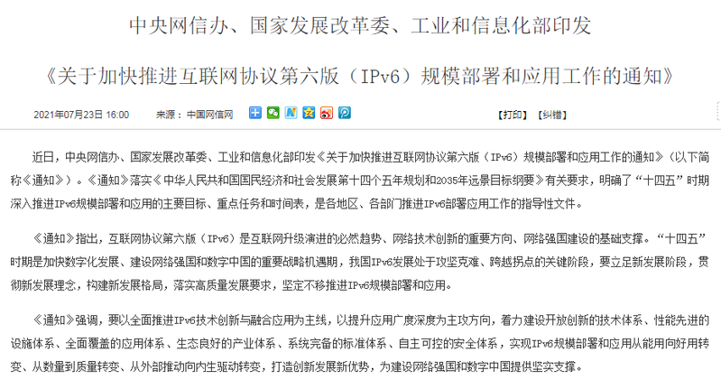 近日,中央網信辦、國家發(fā)展改革委、工業(yè)和信息化部印發(fā)《關于加快推進互聯(lián)網協(xié)議第六版(IPv6)規(guī)模部署和應用工作的通知》(以下簡稱《通知》)。《通知》落實《中華人民共和國國民經濟和社會發(fā)展第十四個五年規(guī)劃和2035年遠景目標綱要》有關要求,明確了“十四五”時期深入推進IPv6規(guī)模部署和應用的主要目標、重點任務和時間表,是各地區(qū)、各部門推進IPv6部署應用工作的指導性文件。《通知》指出,互聯(lián)網協(xié)議第...