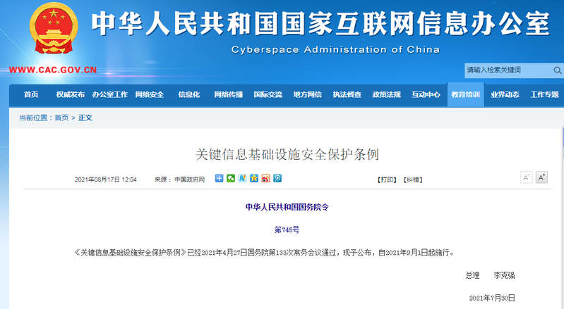 中華人民共和國國務院令第745號《關鍵信息基礎設施安全保護條例》已經2021年4月27日國務院第133次常務會議通過,現(xiàn)予公布,自2021年9月1日起施行。總理 李克強2021年7月30日關鍵信息基礎設施安全保護條例第一章 總 則第一條 為了保障關鍵信息基礎設施安全,維護網絡安全,根據《中華人民共和國網絡安全法》,制定本條例。第二條 本條例所稱關鍵信息基礎設施,是指公共通信和信息服務、能源、交...